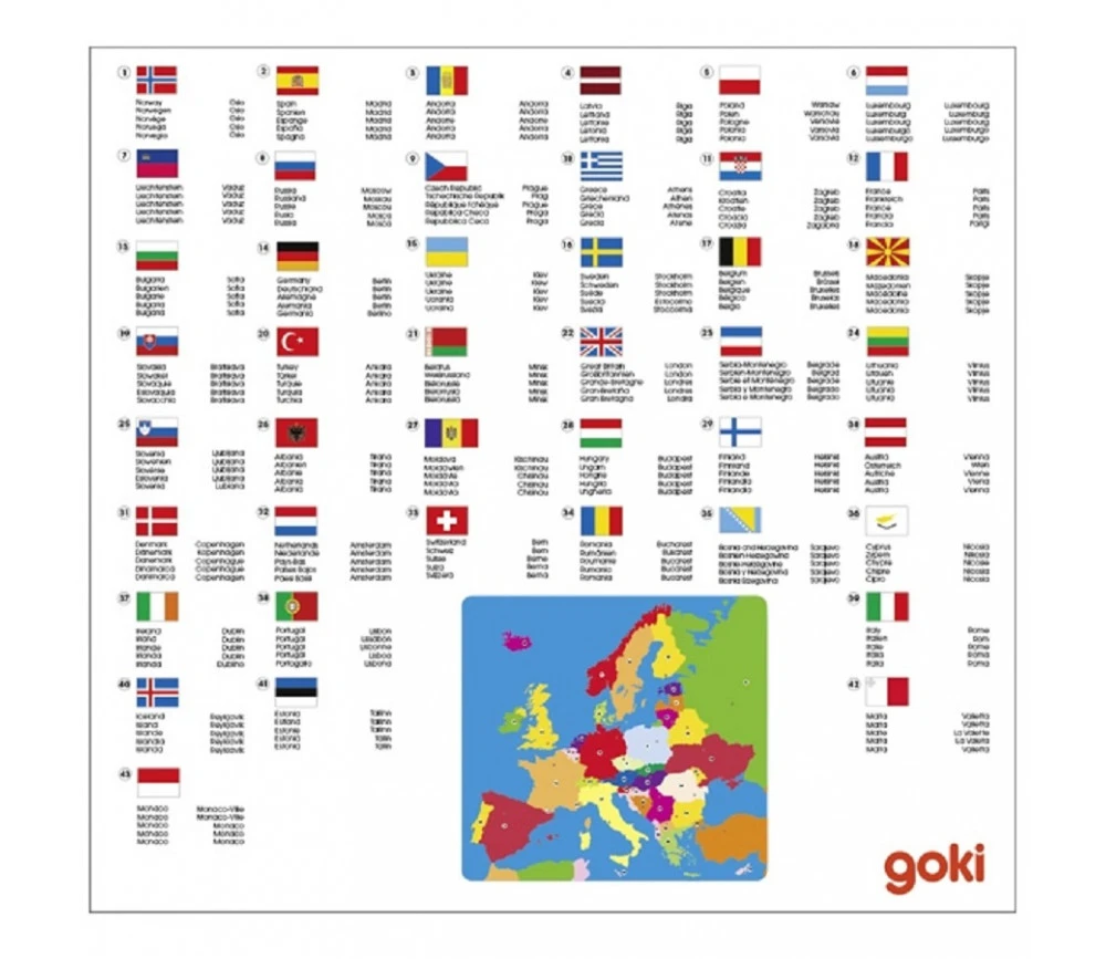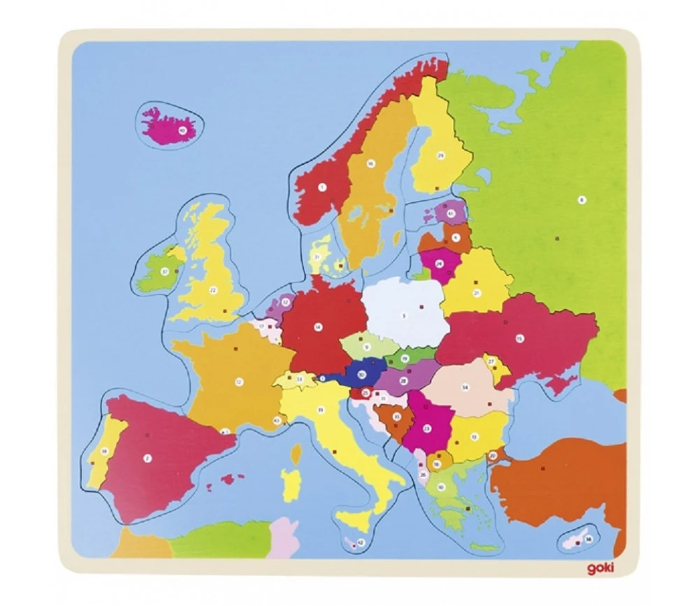 Puzzle en bois découverte de l’Europe avec les pays numérotés. 35 pièces colorées à assembler sur un cadre en bois pour apprendre et situer les pays d’Europe. Au dos du cadre, tous les pays sont numérotés avec leur drapeau et leur capitale.
