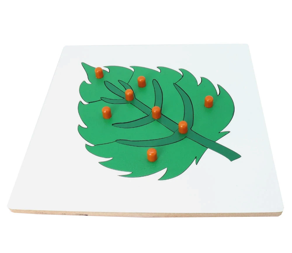 Puzzle en bois feuille à assembler avec 8 pièces à boutons de préhension pour faciliter la manipulation et la mise en place sur le cadre.