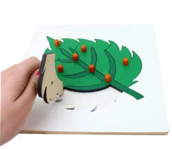 Jeu de motricité et de réflexion de la méthodologie Montessori pour l’apprentissage du monde et de la coordination vision/mains. Les tout-petits vont adorer mettre en place les pièces et assembler cette jolie feuille.