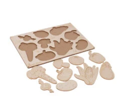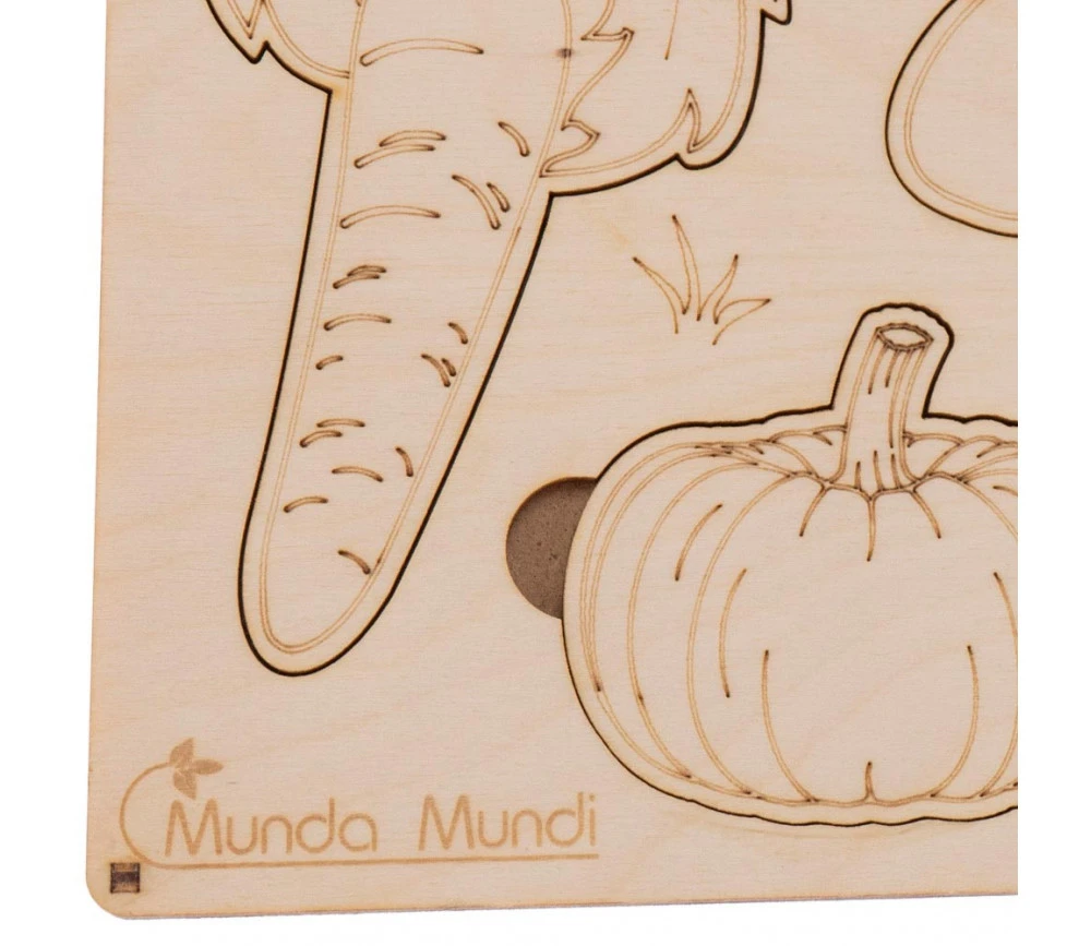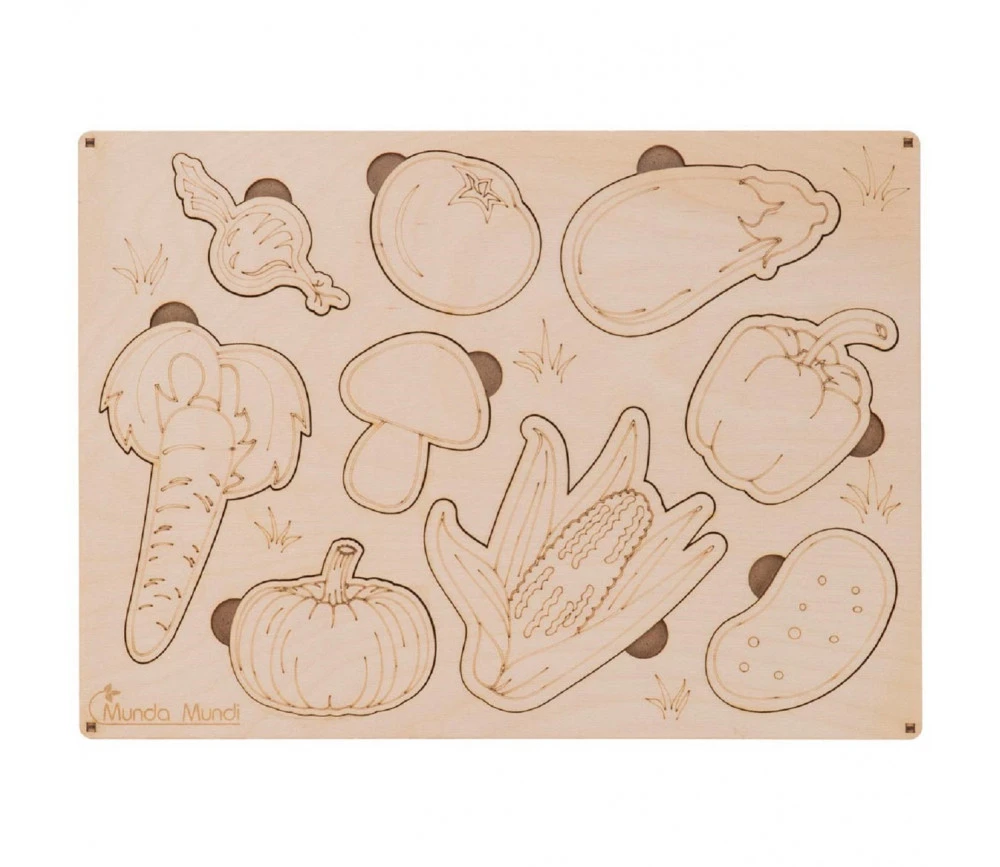 Puzzle en bois 2 jeux en un : reconnaitre et trouver l’emplacement des légumes et les colorier pour décorer les pièces.
