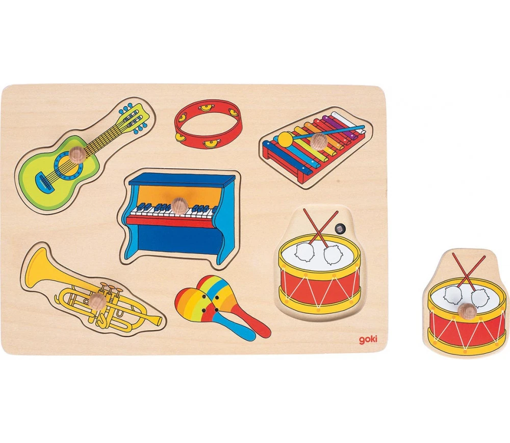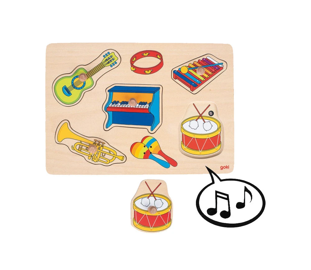 Puzzle en bois sonore à encastrer avec 5 pièces instruments de musique avec bouton.