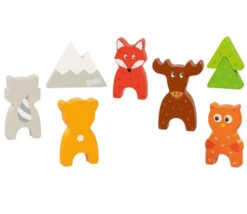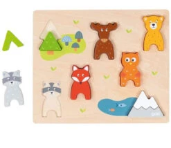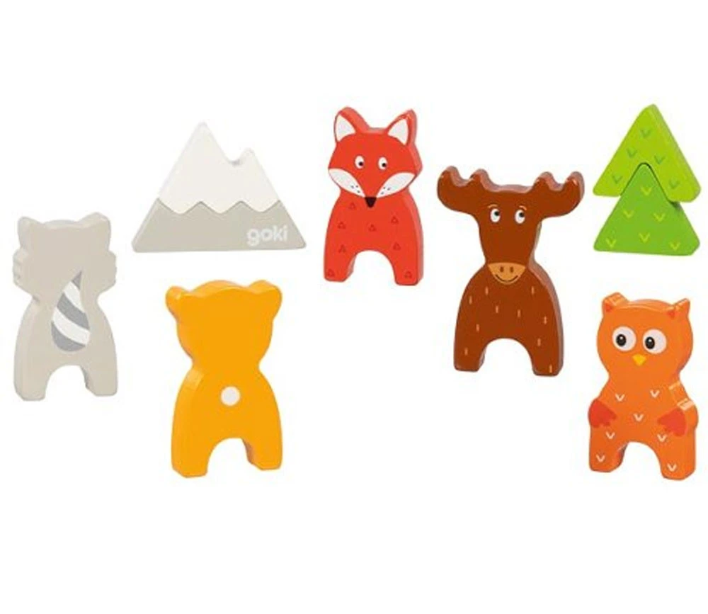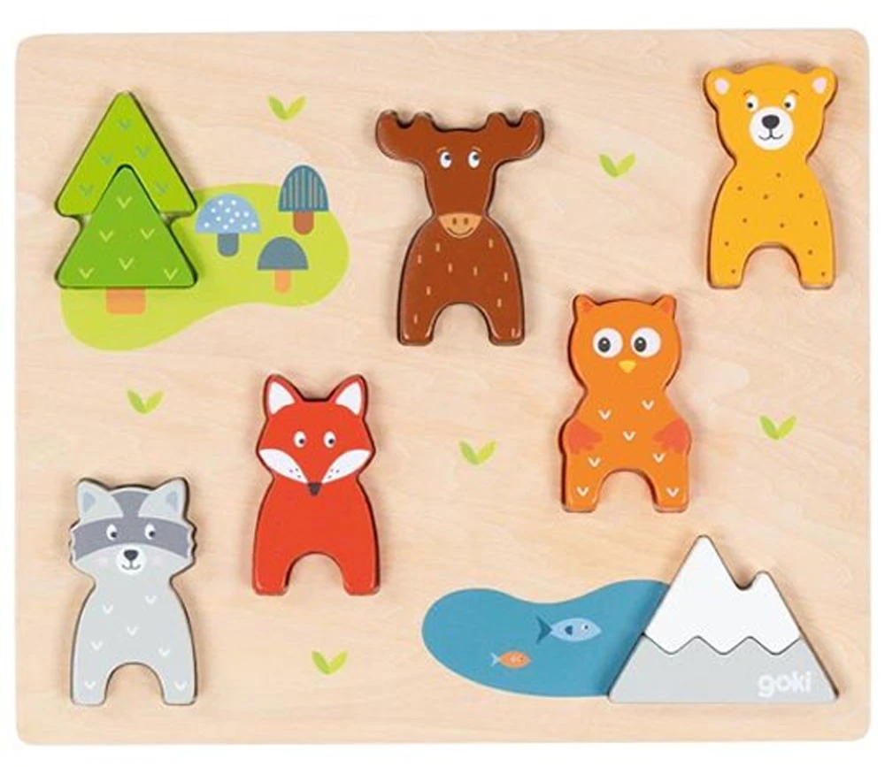 - 8 pièces en bois colorées avec encoches à encastrer : 1 raton-laveur, 1 sapin en 2 morceaux, 1 hibou, 1 montagne, 1 renard, 1 ours