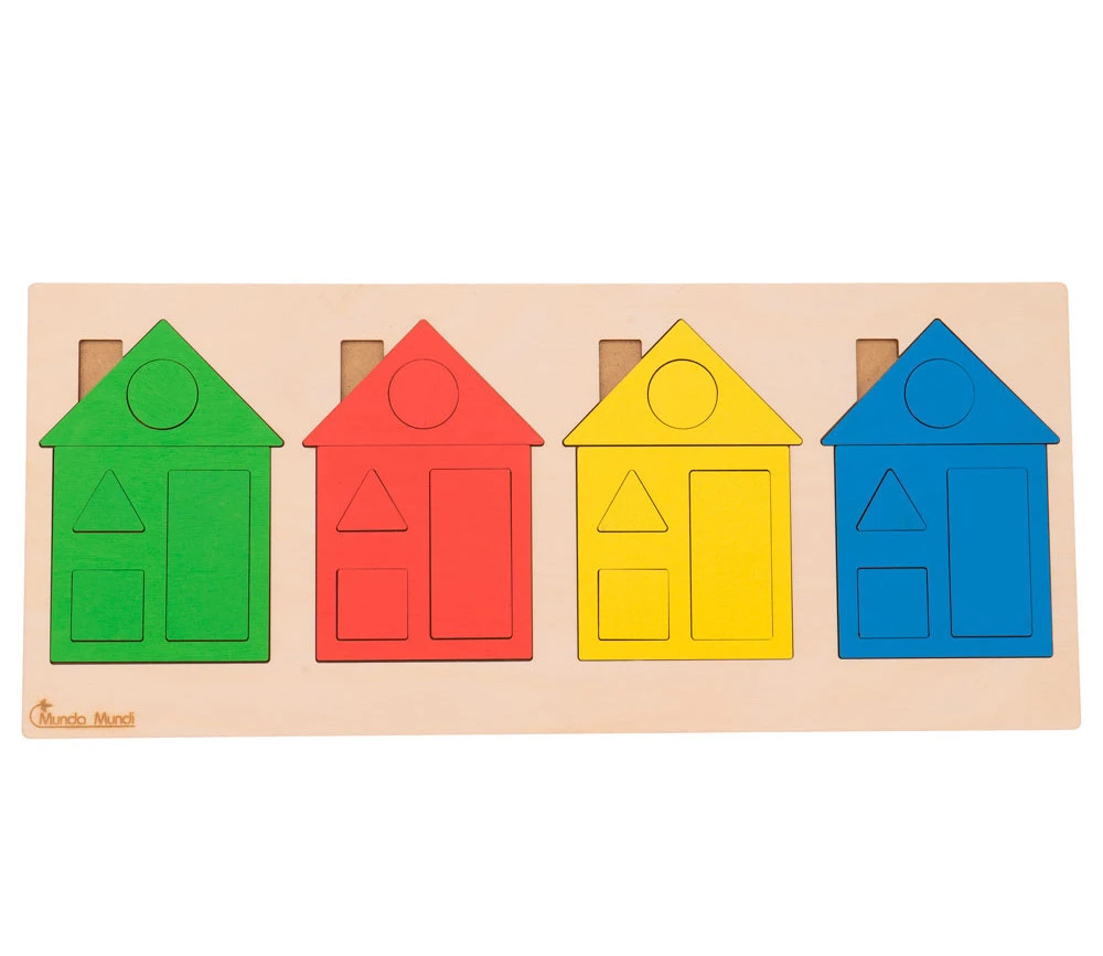 - 4 maisons colorées en rouge, vert, jaune et bleu
