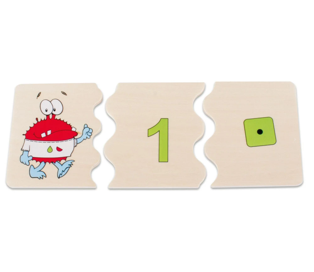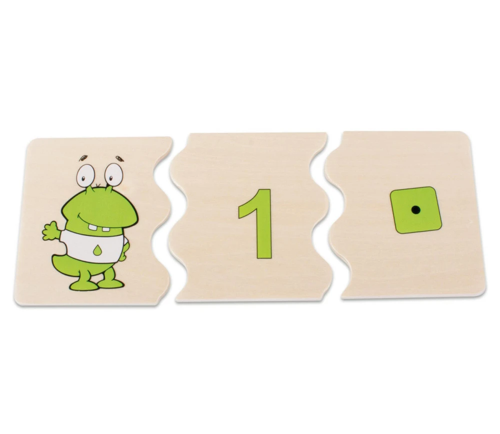 10 petits puzzles en bois 3 pièces pour associer le chiffre avec le nombre d’images. Jeu de bois de qualité pour les premiers pas vers l’apprentissage des mathématiques. Equivalence chiffres, points et quantités.