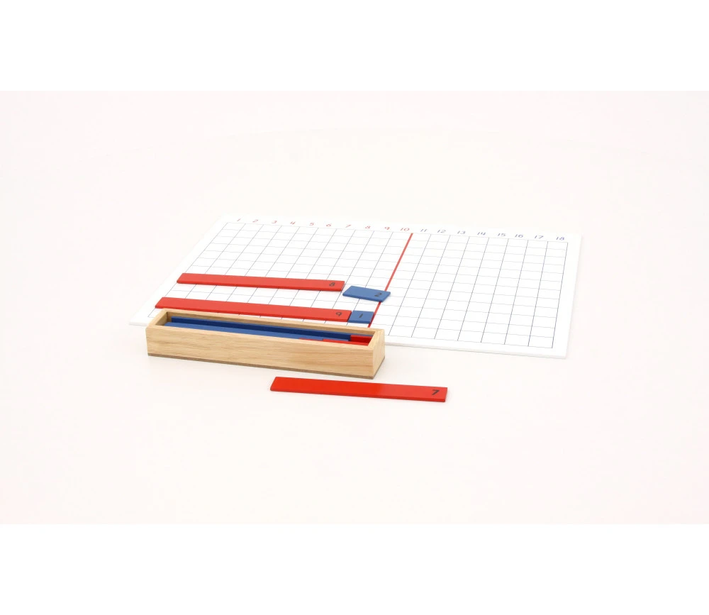18 bâtons numérotés de 1 à 9 avec plateau quadrillé de 1 à 18 pour apprentissage des additions.