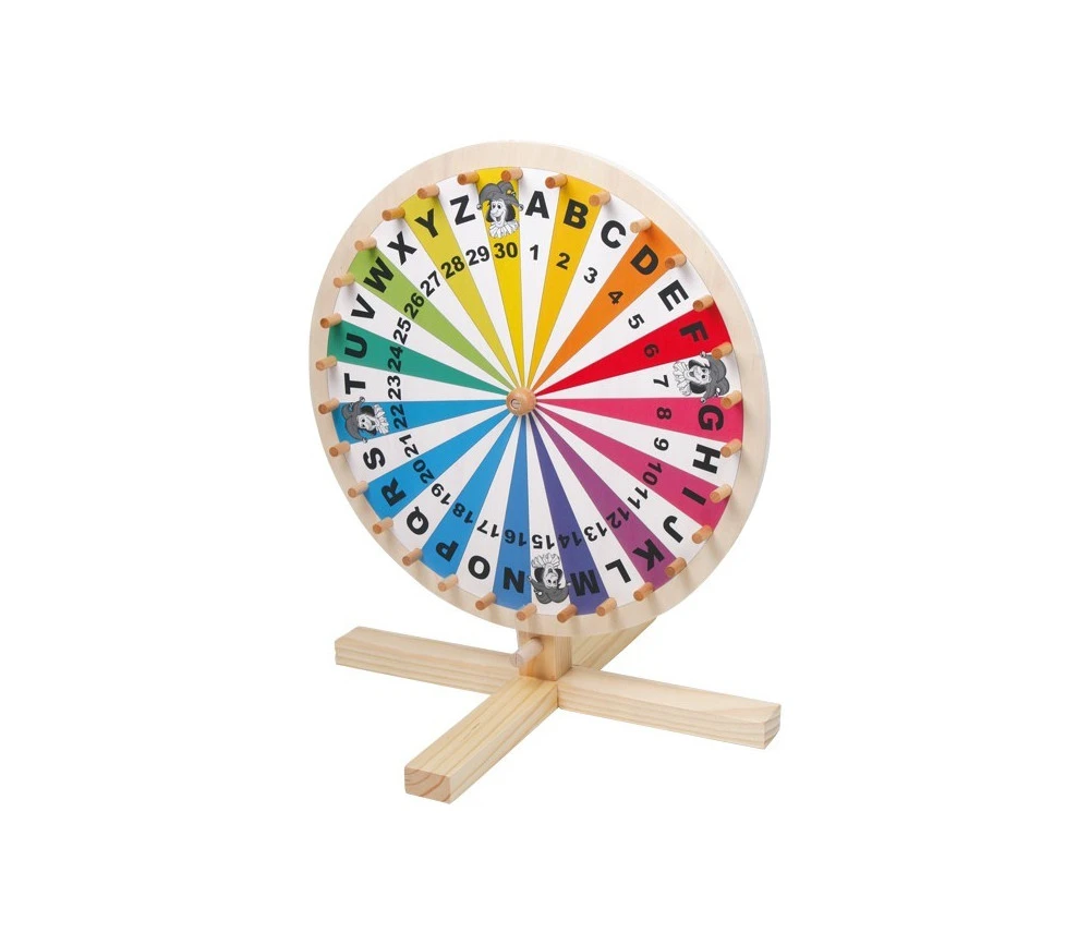 Super roue en bois avec les chiffres imprimérs de 1 à 30, les lettres de l’alphabet de A jusqu’à Z (4 jokers). La roue est fabriquée entièrement en bois. Elle tourne facilement, chaque tranche est séparée par des chevilles de bois.