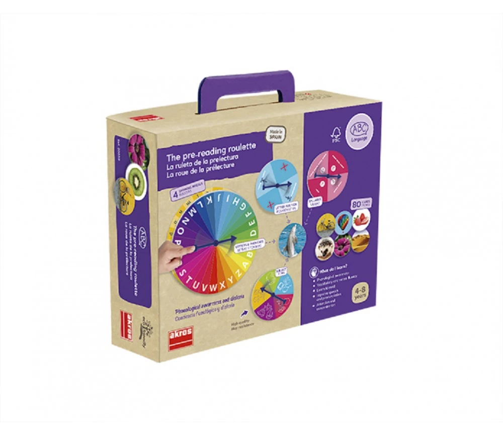 Set de pré-lecture composé de roues et de fiches avec photos : faire tourner la roue et rechercher les images qui commencent par une lettre ou un phonème ou qui ont le même nombre de syllabes, ou qui contiennent la lettre ou le phonème.