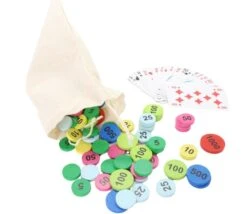 Sachet coton avec jetons de mise en bois. 100 jetons numérotés colorés pour jeux de cartes, jeux de dés ou autre jeux de société.