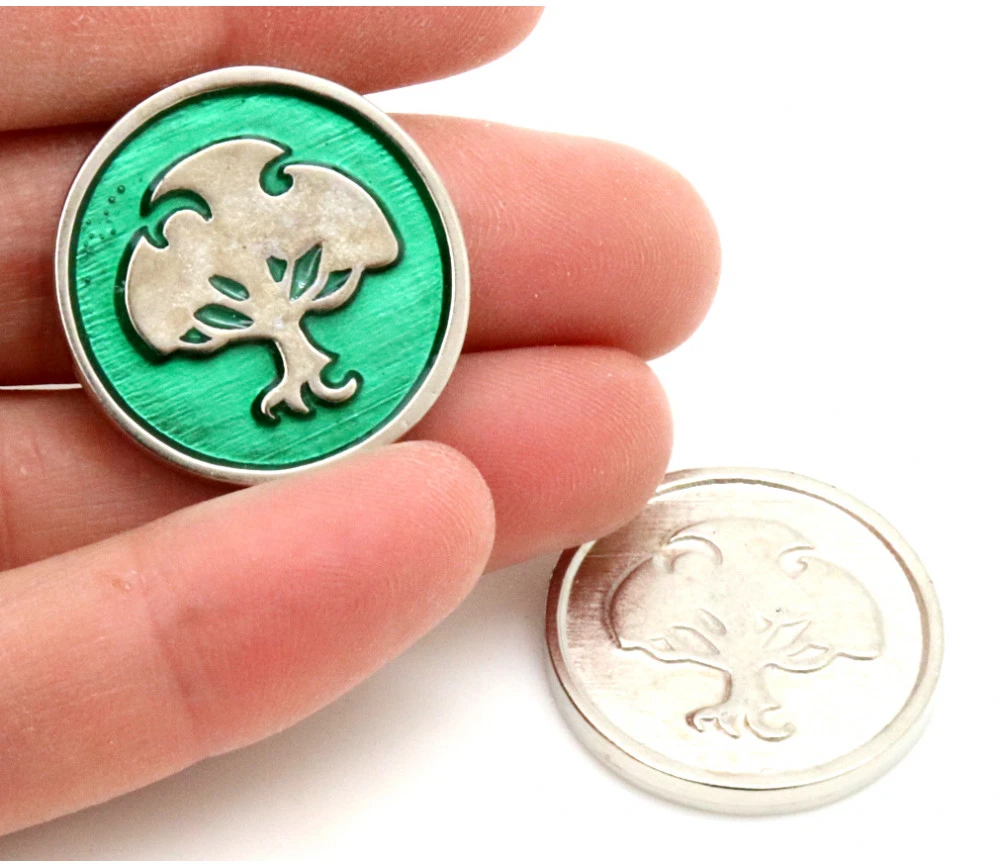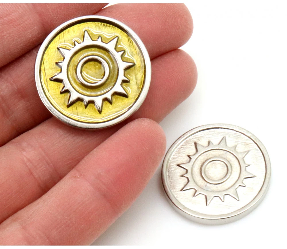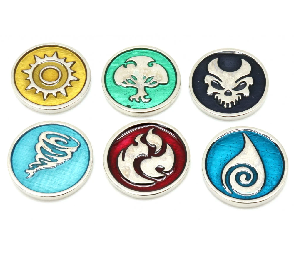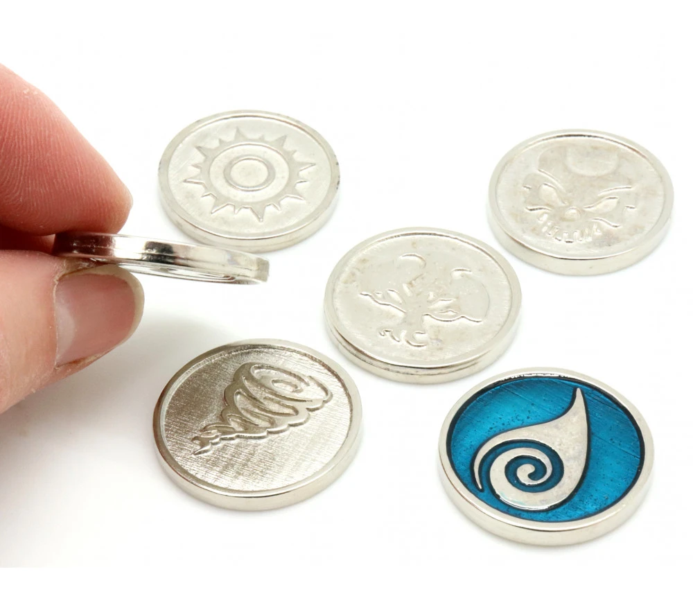 Set de 6 pièces métal pour jeu de 2.8 cm de diamètre Gravées des 2 côtés, recto des pièces en couleur métal argenté et le verso un mélange de la couleur de l’élément et de la couleur du métal. 1 pièce pour chaque thème Elément : Mort, feu, nature, eau, lumière et air.
