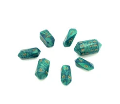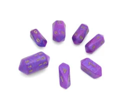 Lot de 7 dés à plusieurs faces D4, D6, D8, 2D10, D12, D20 mais forme spécial de Barril. Dé pour jeux de rôle ou jeux de société. Chiffres gravé en couleur doré. es chiffres sont gravés en doré sur les faces. Les dés font de jolis reflets. Lot de 7 dés spéciaux avec forme originale pour changer du traditionnel set de 7 dés jeux de rôle standard. Ce set de barrels est disponibles en 3 couleurs nacrés bleu, vert ou violet. La couleur est mise au hasard en fonction des disponibilités du stock.
