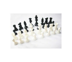 - 32 pions jeu d’échec (16 pièces noir et 16 pièces blanc-crème). Hauteur du roi 9,7 cm, hauteur d’un pion 4,5 cm. Set de 32 Pions plastique. Feutrine sous les pièces. Pièces échec Staunton 5.