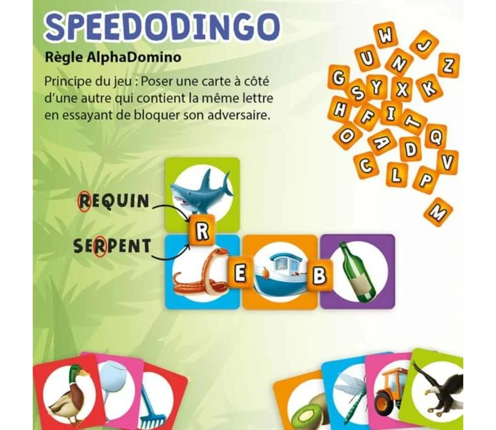 Alpha Speed (observation-rapidité) : Les joueurs observent l’image (sans voir le mot) et doivent prendre le plus rapidement possible les lettres qui composent le mot. On vérifie l’orthographe du mot au dos de la carte avant de gagner des points. Un nombre de jetons limité permet un équilibre dans la répartition des chances.
