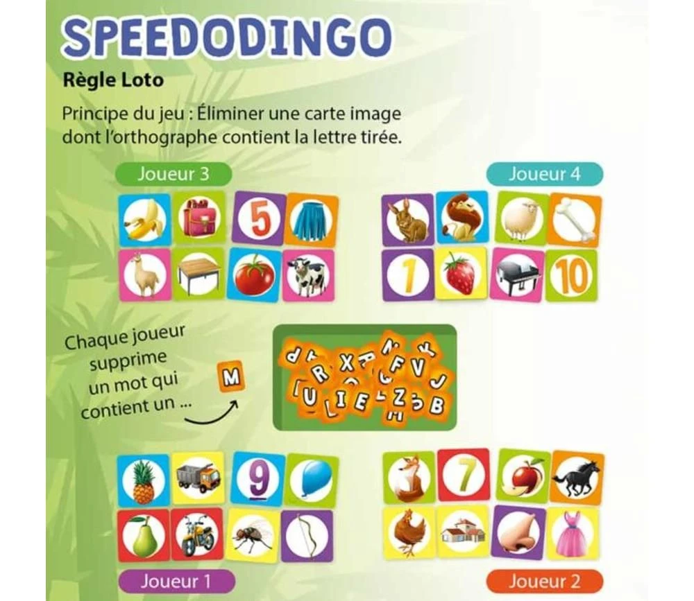 Loto (observation-hasard) : Le principe est d’éliminer une carte image dont l’orthographe contient la lettre tirée. Le premier joueur qui a éliminé toutes ses 9 cartes a gagné.