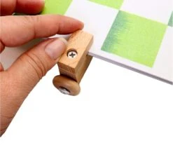 Support tournant en bois à monter comprenant 2 tiges avec roulettes en bout et encoche pour glisser le plateau de jeu.