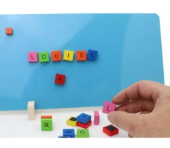 Coffret Grand tableau aimanté et 77 jetons lettres en bois coloré :
