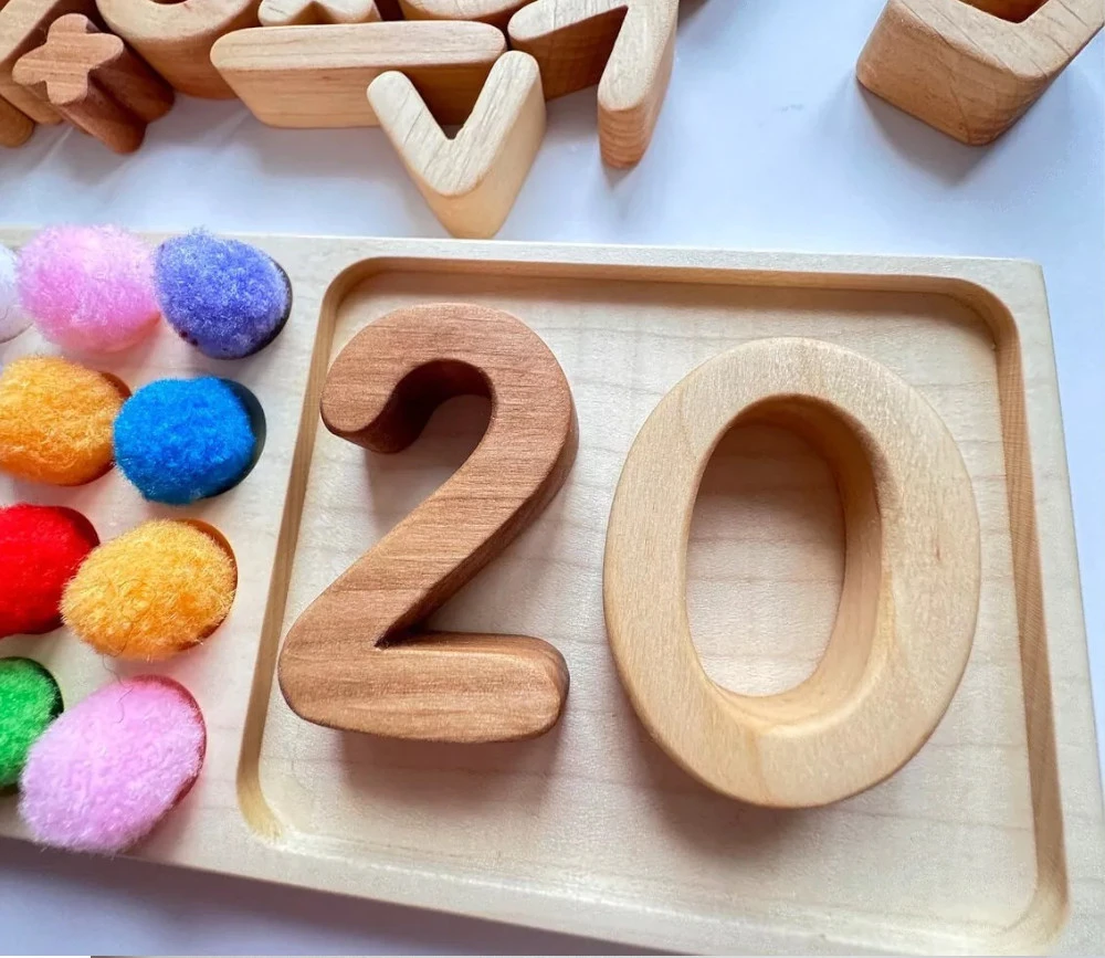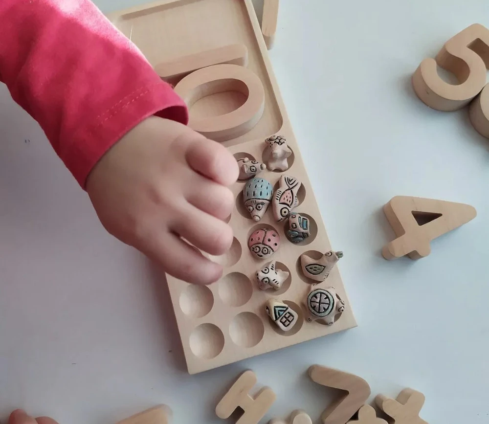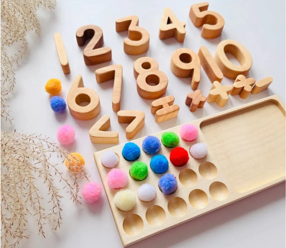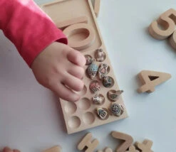 Plateau en bois à utiliser comme une ardoise pour disposer les chiffres et les signes en opérations simples pour l’apprentissage des mathématiques
