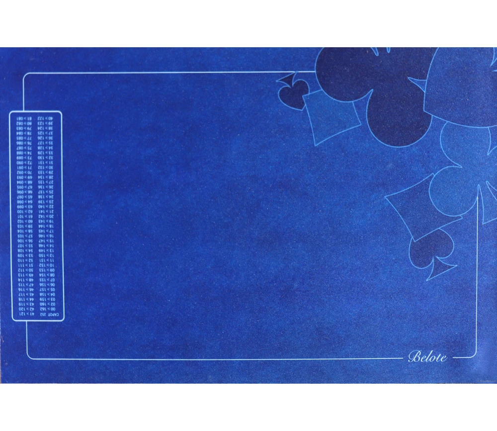 Tapis de jeu pour jeux de cartes de 40 x 60 cm Belote, couleur bleue et motif ornement coeur/pique/carreau/trèfle. Tapis néoprène et revêtement Jersey. Tapis pour jouer à la Belote ou autres jeux de cartes. Matière douce et agréable qui vous permet de ramasser plus facilement vos cartes et tient bien sur votre table de jeu. Bon maintien du tapis.