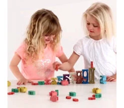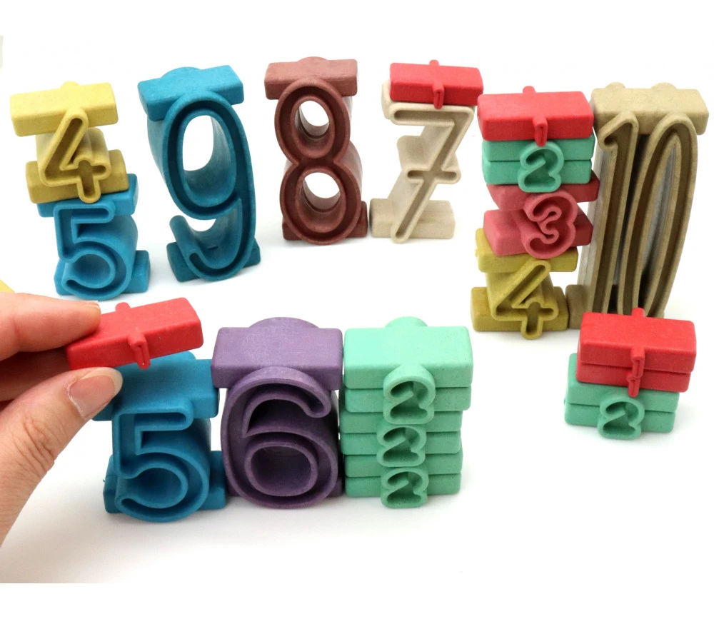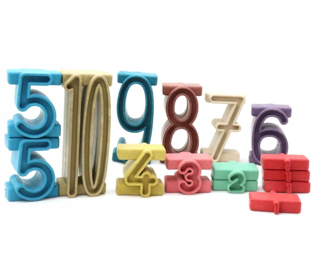 Découverte des nombres : manipulation des chiffres, apprentissage de l’écriture en suivant le relief avec son doigt, empilement, création de tour, création de série.