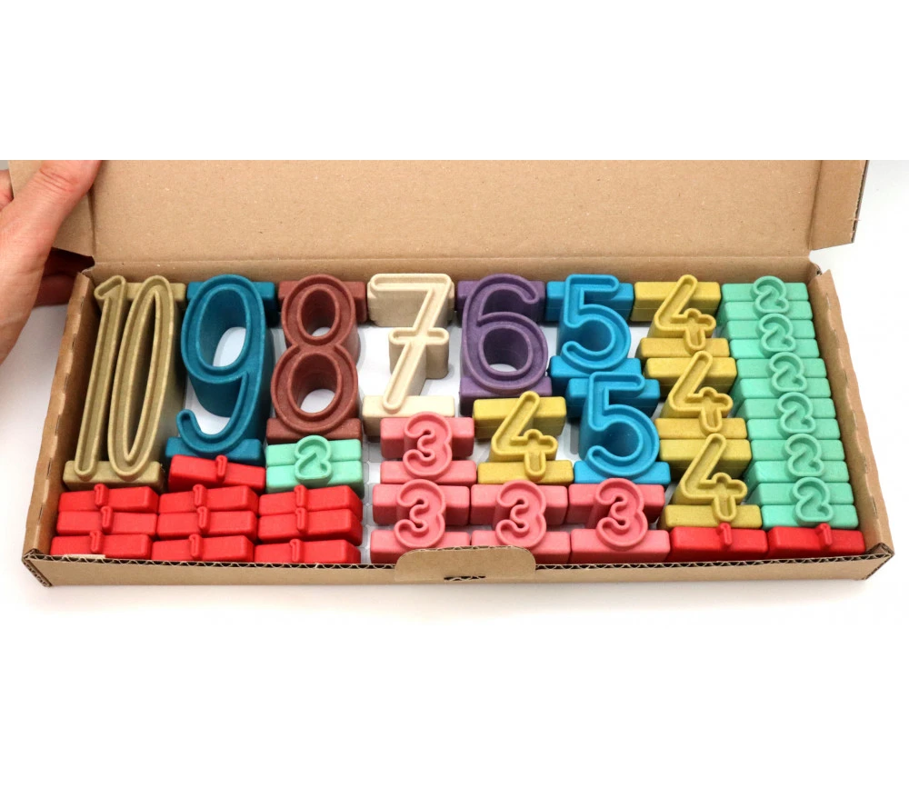 Set Tour des nombres Colorés Montessori comprend 34 pièces en bois recyclé Re-Wood :