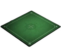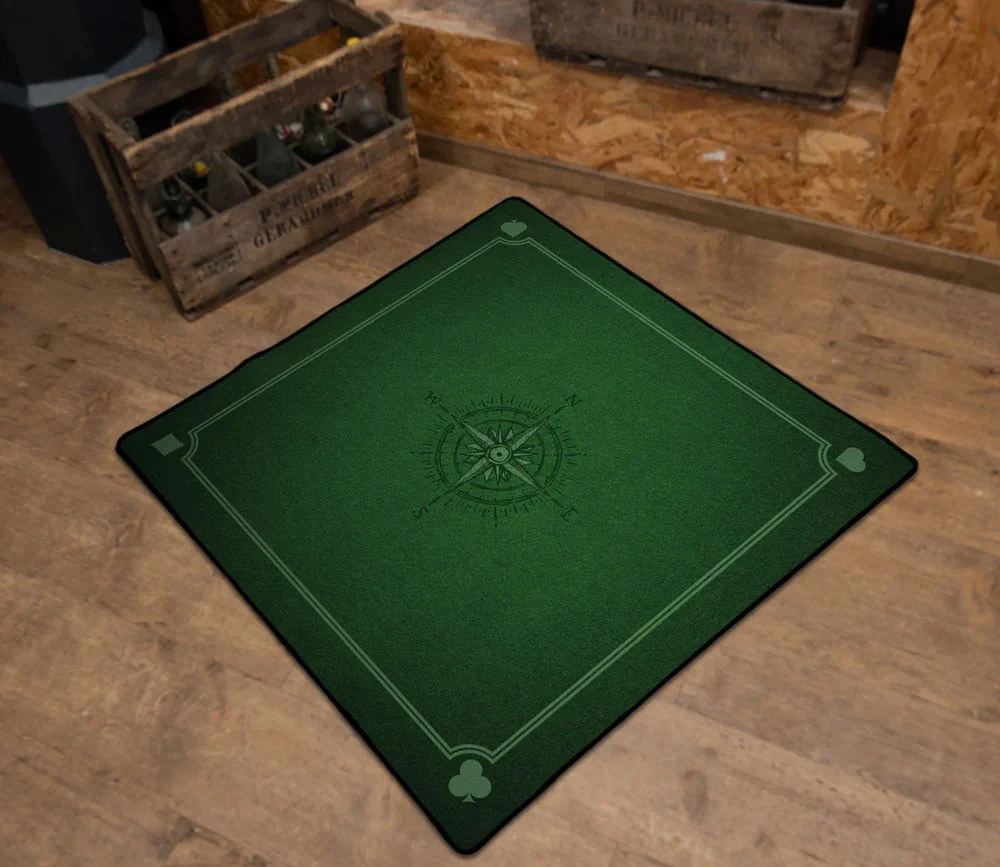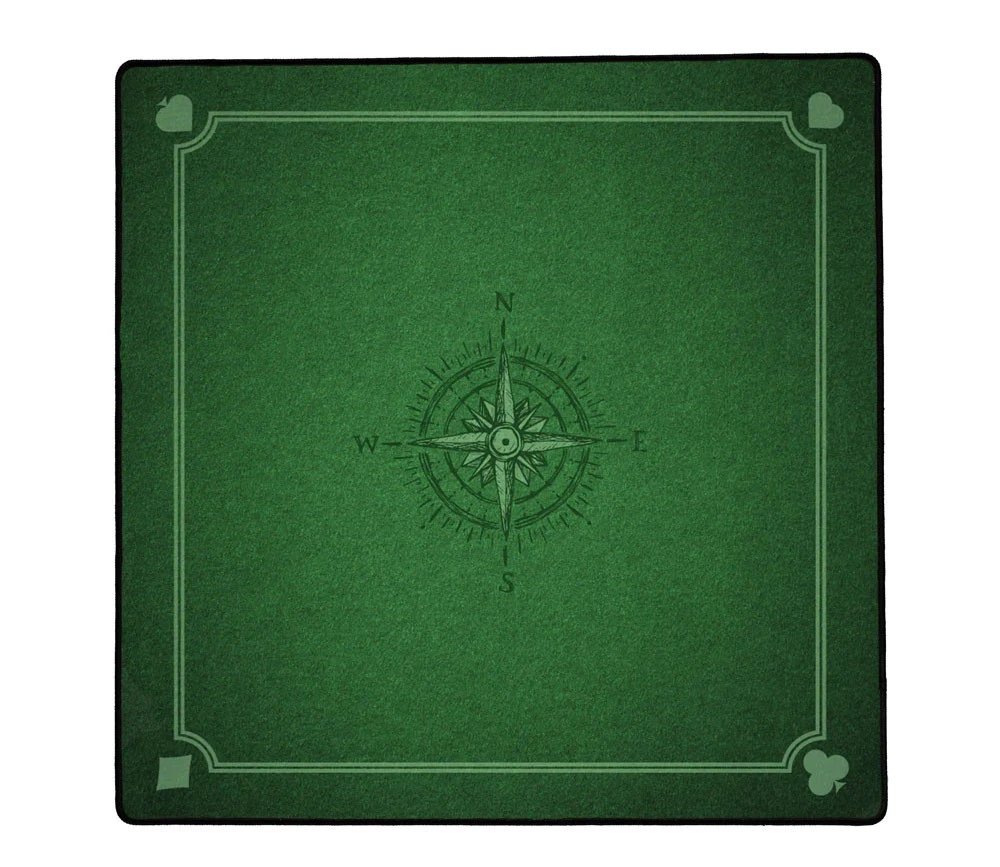 Grand tapis pour jeux de cartes fond vert avec les points cardinaux sur la boussole centrale. L’illustration est discrète et ne perturbe pas le jeu. Tapis qui peut convenir pour tout type de jeux avec des cartes.